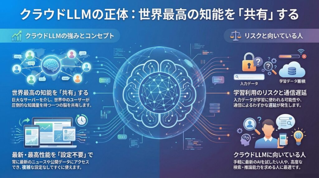 インターネット経由で利用するため、常に最新のニュースや膨大な公開データにアクセスし、高度な検索や複雑な推論を行うことができる。世界中のユーザーが同じ巨大な脳を共有して使うイメージであり、圧倒的な知識量と処理能力を誇る一方で、入力したデータが外部のネットワークを通過するという特性がある。